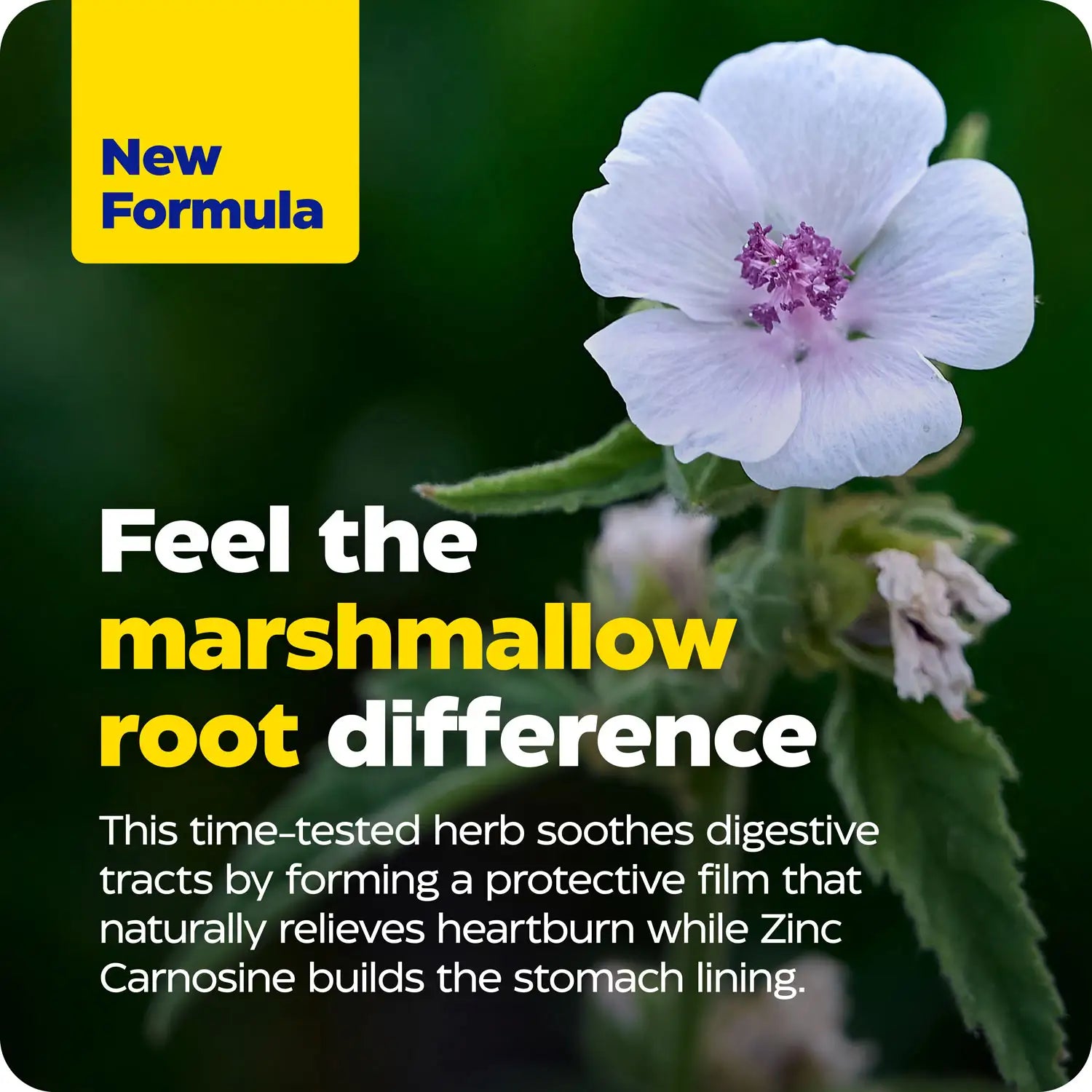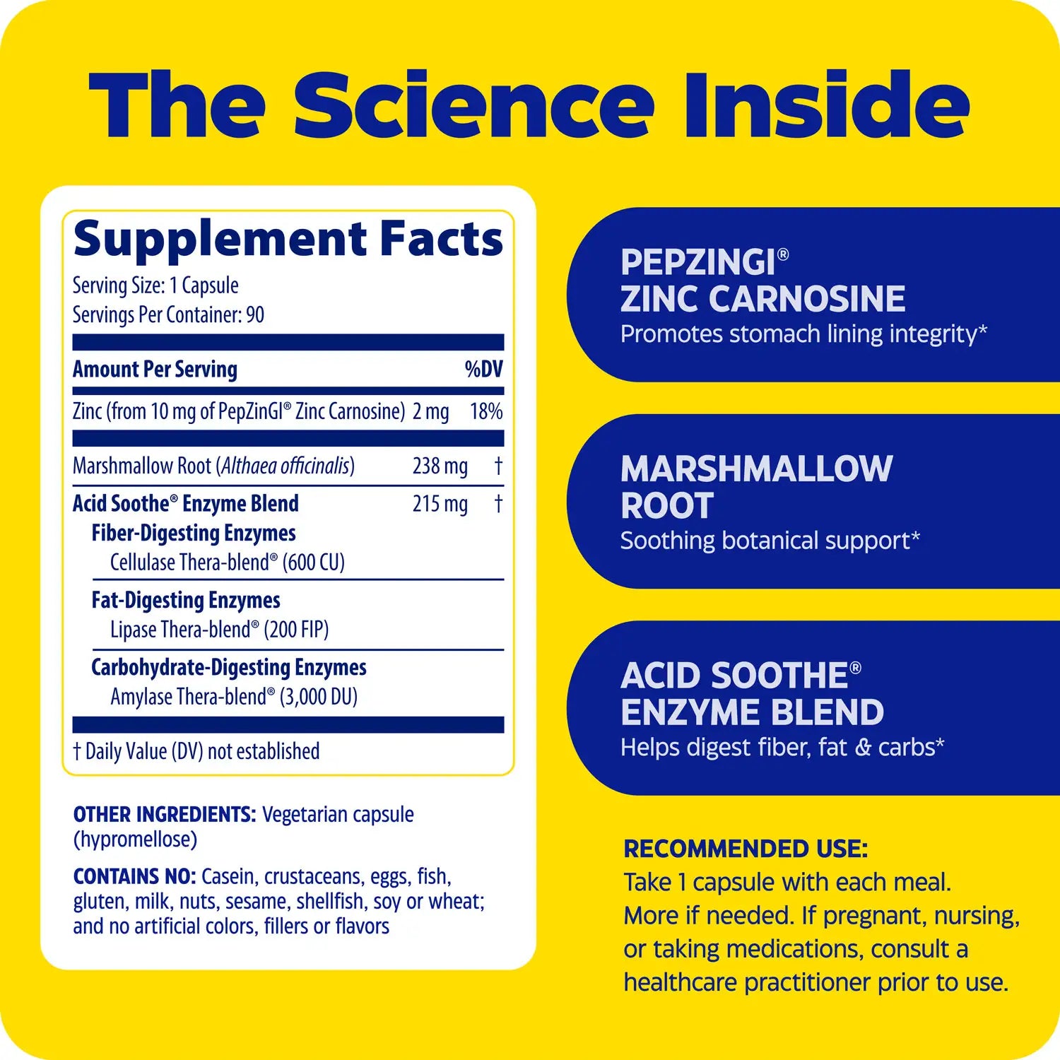 Acid Soothe® also contains a blend of minerals and botanicals, including zinc carnosine, marshmallow root, papaya leaf and gotu kola. Zinc carnosine optimizes the mucosal lining of the stomach.* Marshmallow root relieves irritation of the mucous membranes in the gut and helps balance the amount of mucous that is made.* Papaya leaf is known to soothe and cleanse the gut.* Gotu kola provides additional support for the tissue of the gut.*