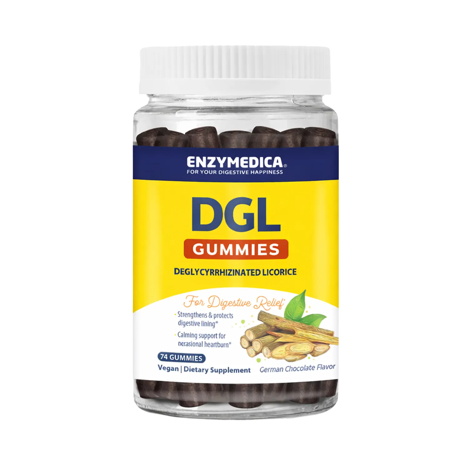 - Delicious, effective DGL in a smooth German Chocolate flavored gummy