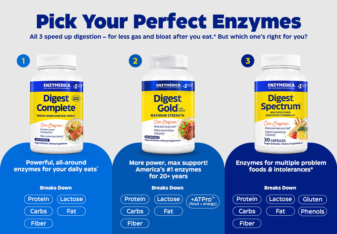 Feel your best before and after you eat – no matter what’s on your plate – with the gold standard in digestive enzymes. No matter what’s on the menu, reach for Digest Gold® – America’s #1 best-selling digestive enzymes for over a decade!+
