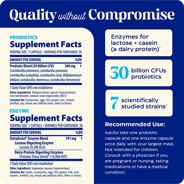 - Fast-acting enzymes to digest dairy (both lactose and protein)