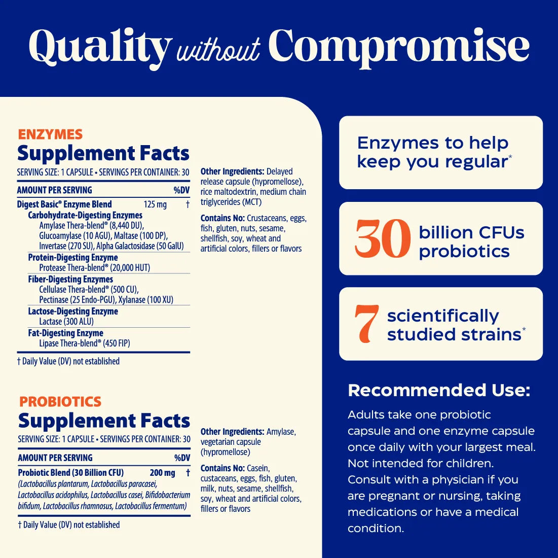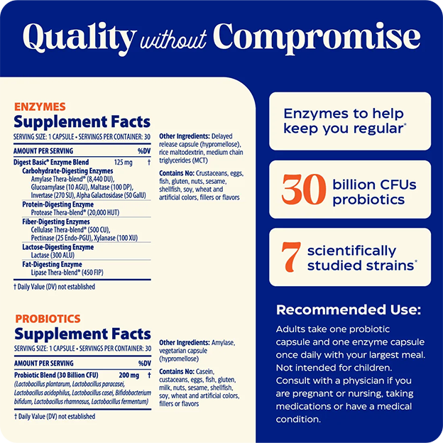Feel your best before and after you eat, with digestive enzymes for your whole plate.* The enzymes in Dinner Duo: Probiotics + Enzymes for Regularity help promote regularity and break down carbs, protein, fiber, dairy and fat.* They help keep things moving.* Since what doesn’t get broken down doesn’t move out, enzymes keep traffic flowing.*